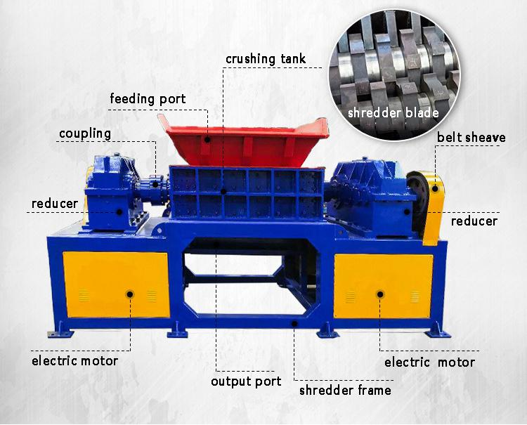 4. Double shaft shredder is able to process a number of different materials; shredder is designed with a powerful engine, long working length and aggressive input, Internal feeding volume bigger than traditional and common single shaft shredder machine and allow you using forklift truck to feed.